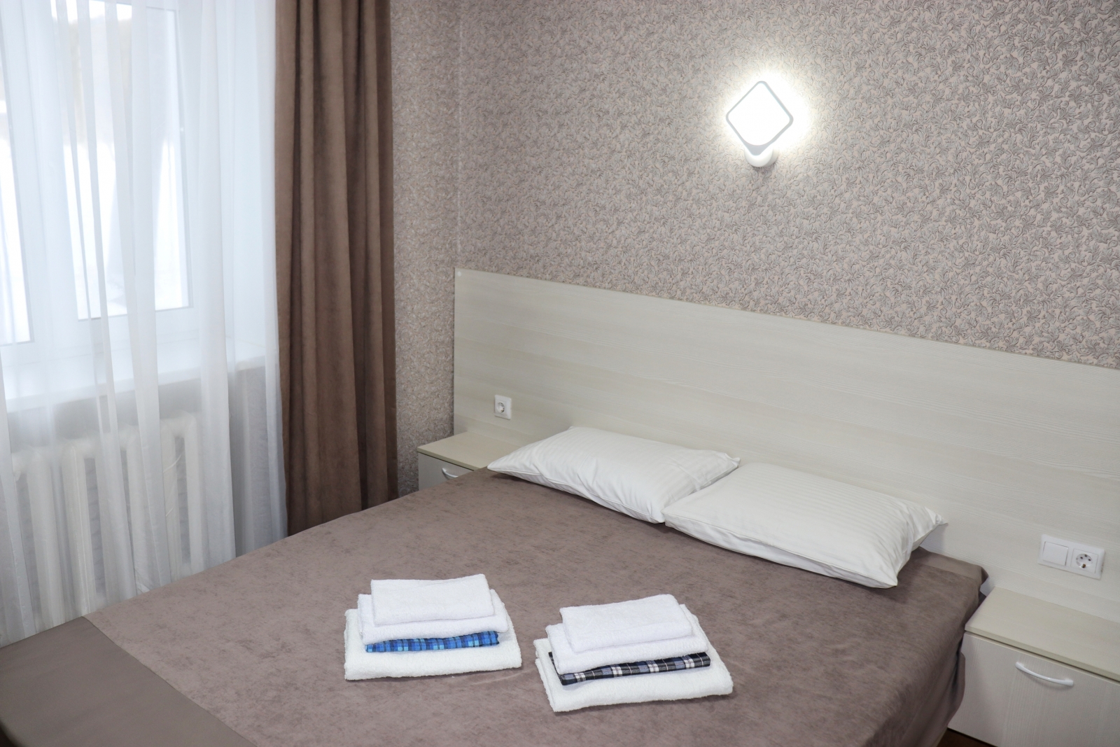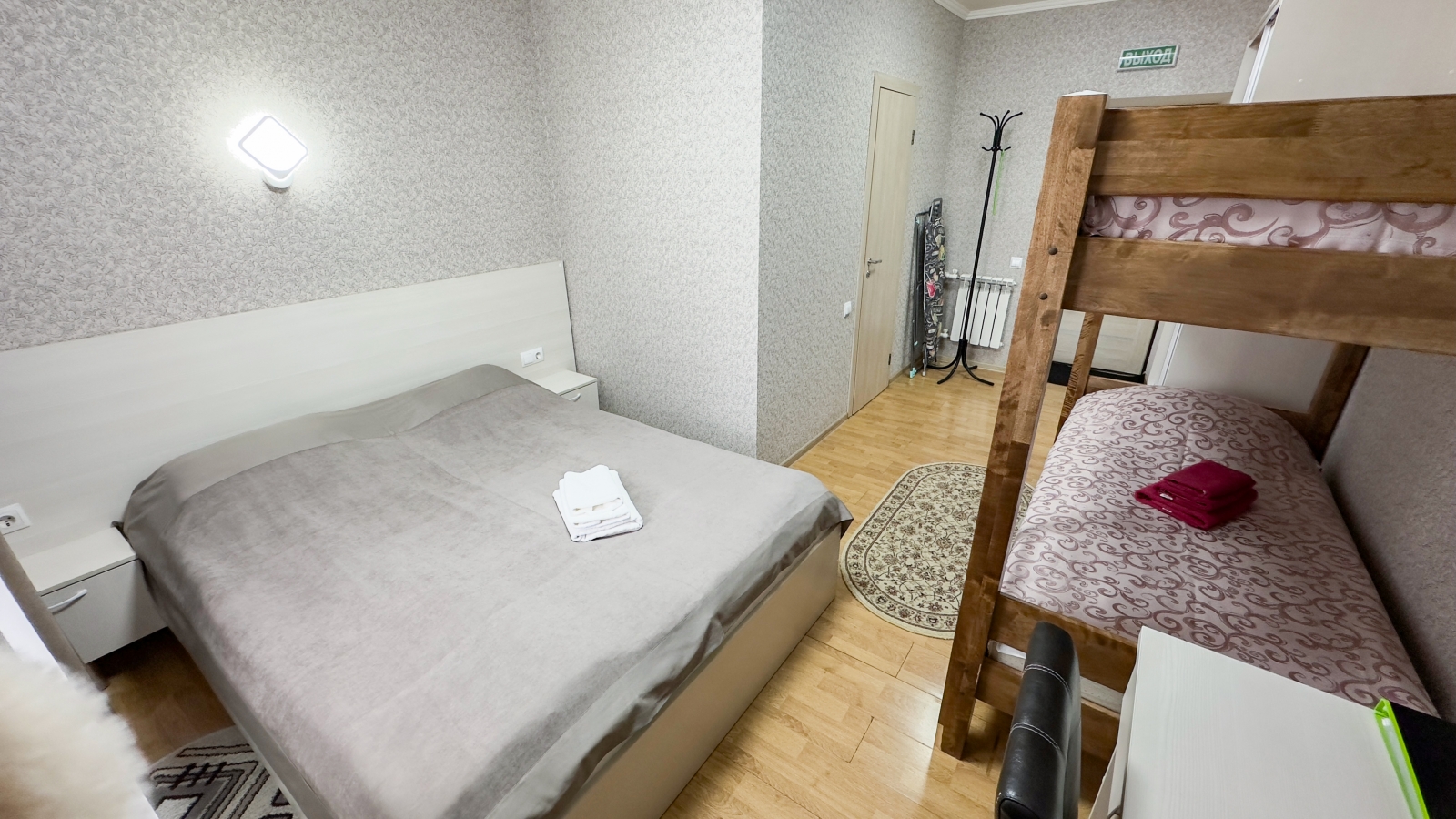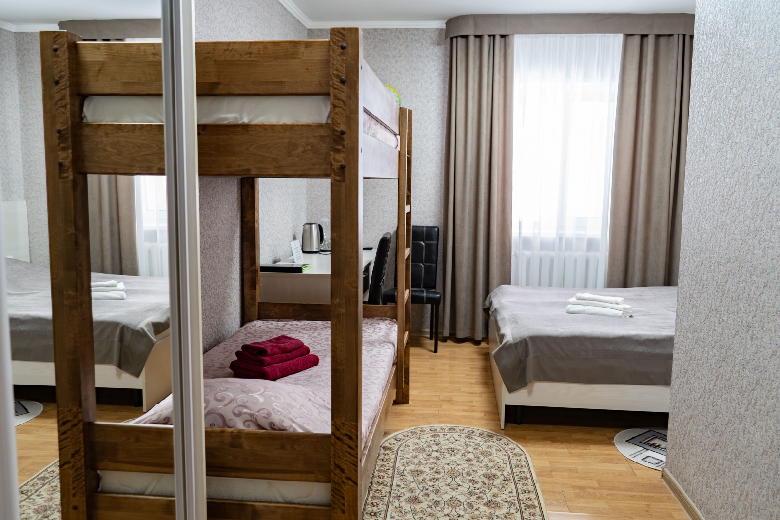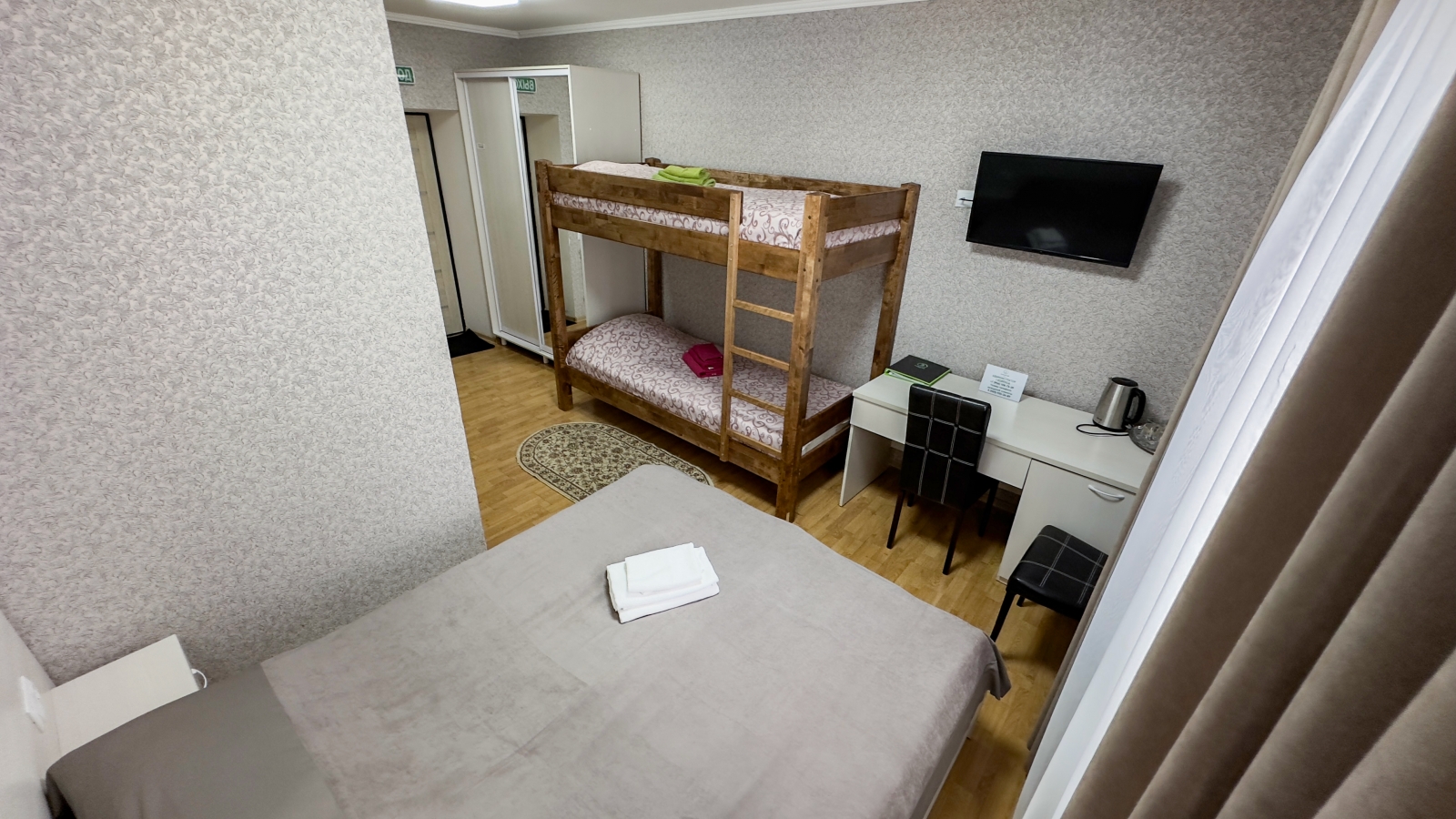 3 осн. места. 2 доп. места. Мебель: кровать двуспальная, кровать двухъярусная, прикроватные тумбочки, стол, стулья, шкаф. Оборудование: мини-холодильник, сейф, телевизор, электрочайник. Санузел: с душем, туалетные принадлежности, фен. Сервис: Wi-Fi бесплатно, смена полотенец, смена постельного белья, уборка номера.