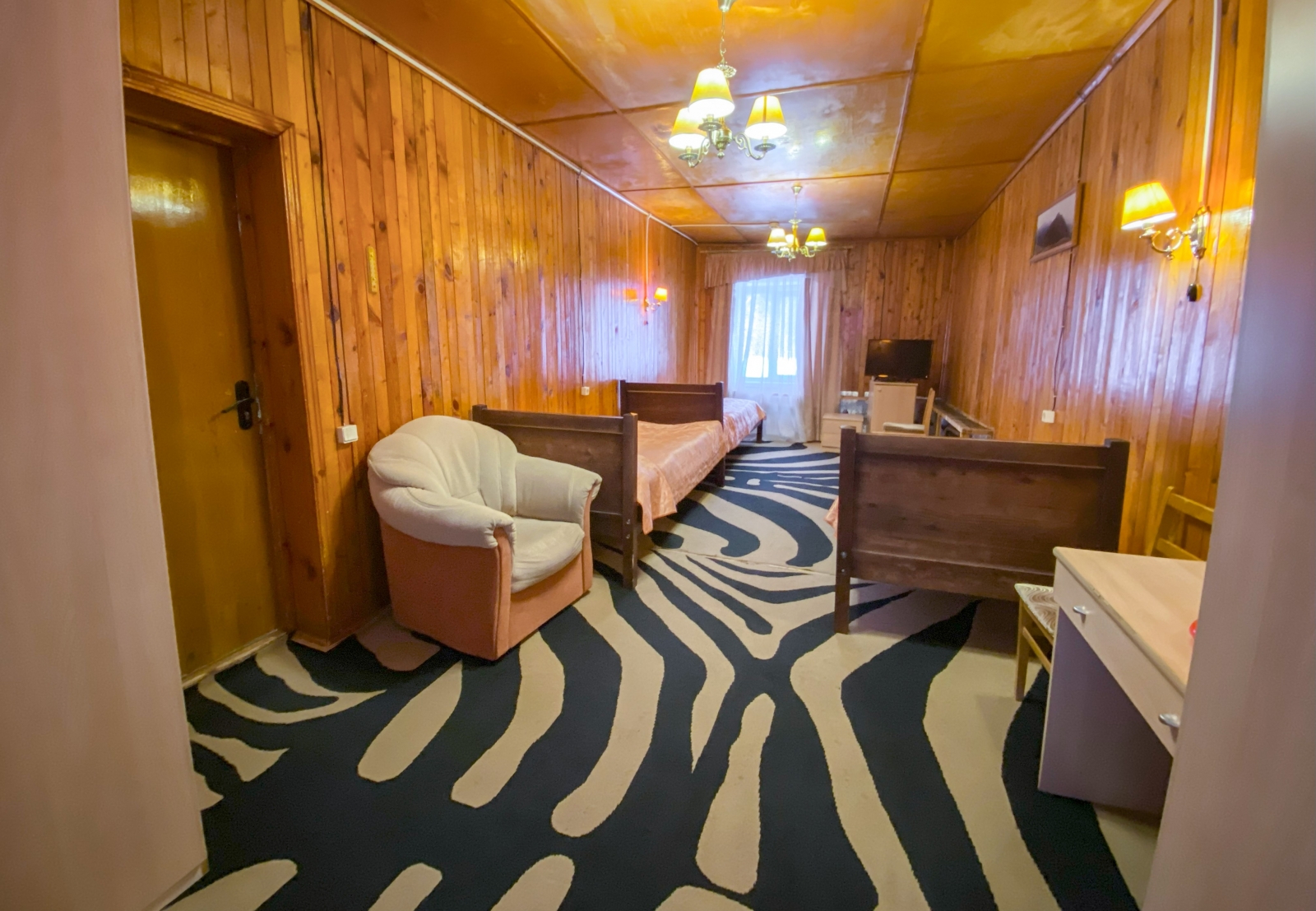 Площадь номера - 24 кв.м. 3 осн. места. 1 доп. место. Мебель: кровати односпальные, прикроватные тумбочки, стол, стулья, шкаф. Оборудование: мини-холодильник, телевизор, электрочайник. Санузел и душевые на этаже. Сервис: Wi-Fi бесплатно, смена полотенец, смена постельного белья, уборка номера.