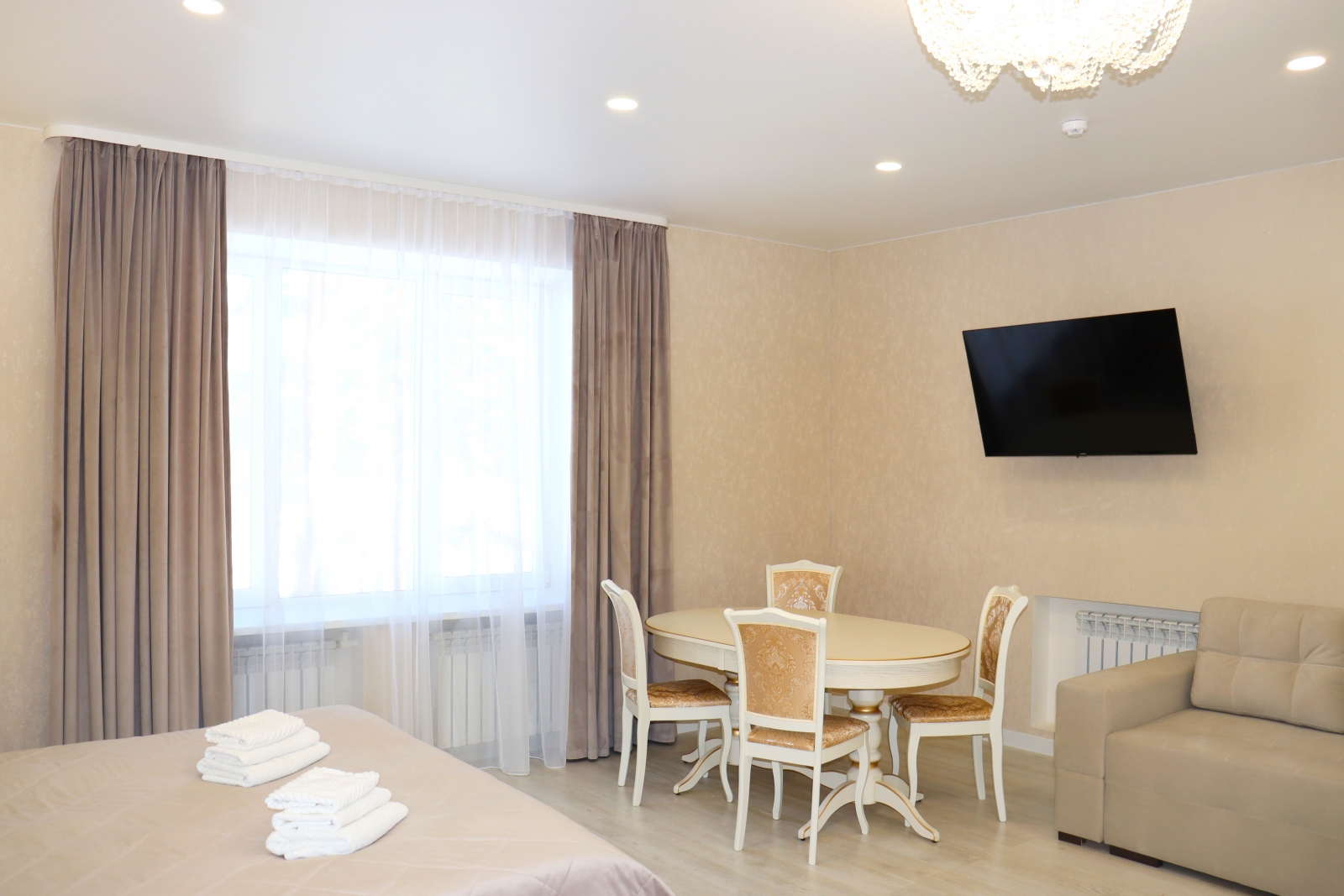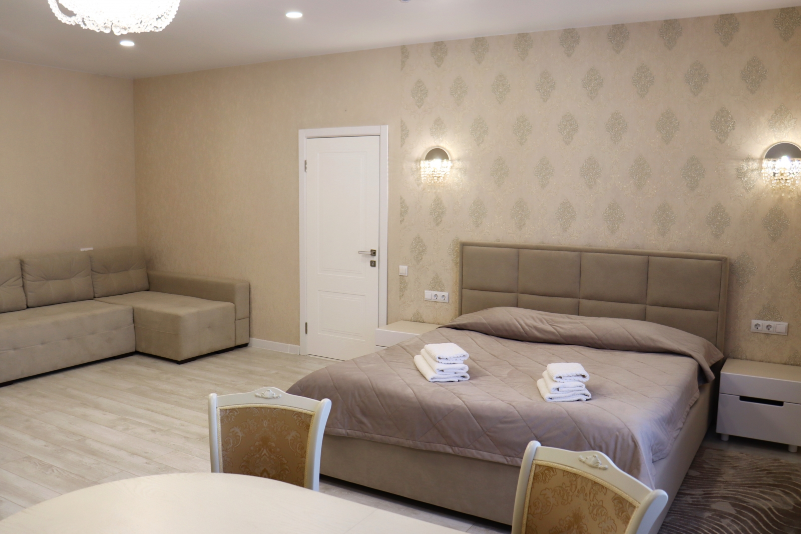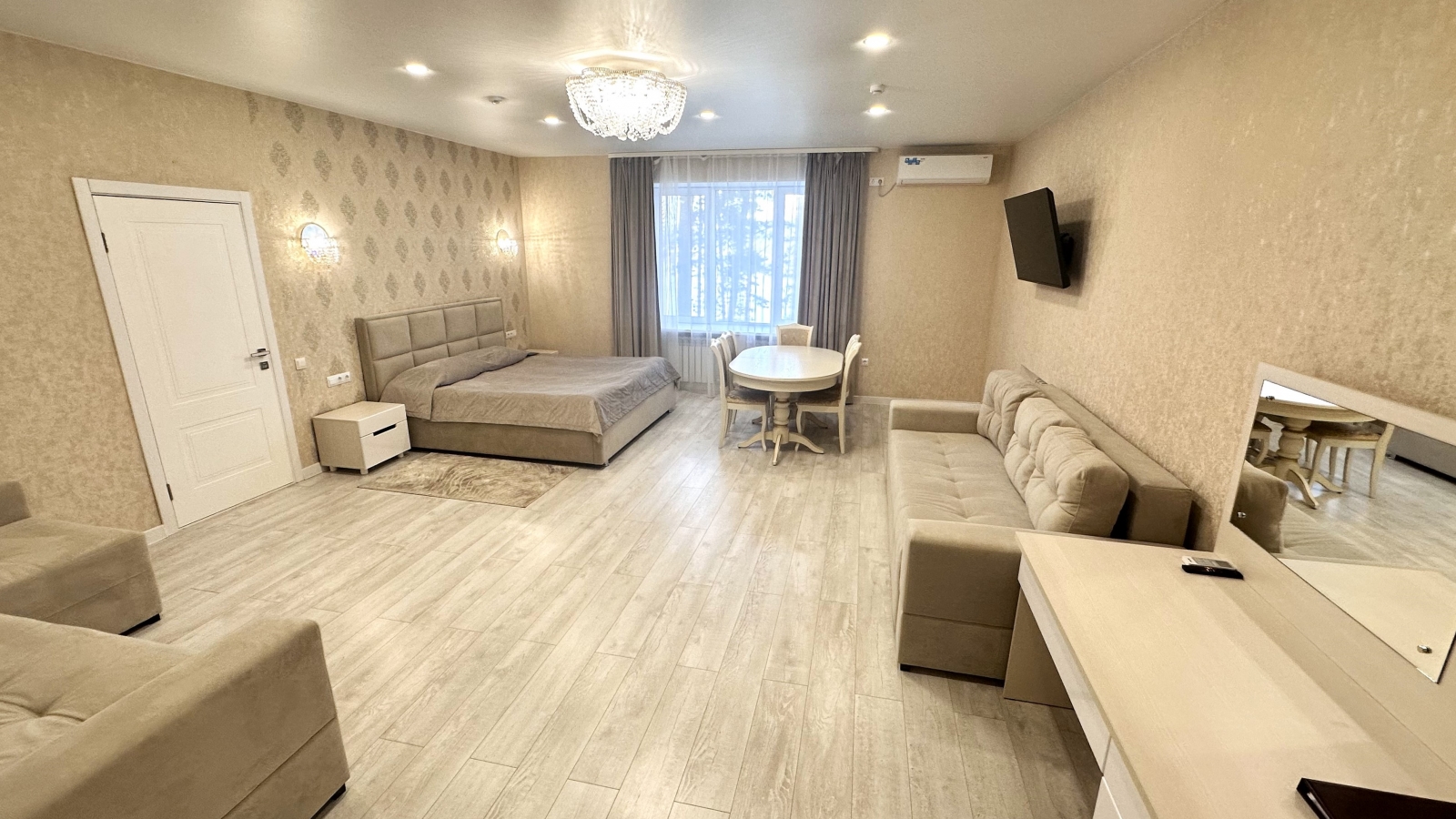Площадь номера - 50 кв.м. 1 осн. место. 2 доп. места. Мебель: диван раскладной, кровать двуспальная, прикроватные тумбочки, стол, стулья, шкаф. Оборудование: кондиционер, мини-холодильник, набор посуды, сейф, телевизор, электрочайник. Санузел: с ванной, туалетные принадлежности, фен. Сервис: Wi-Fi бесплатно, смена полотенец, смена постельного белья, уборка номера.