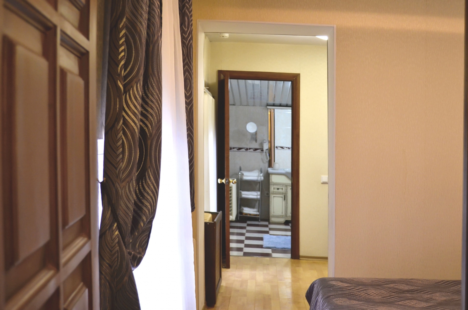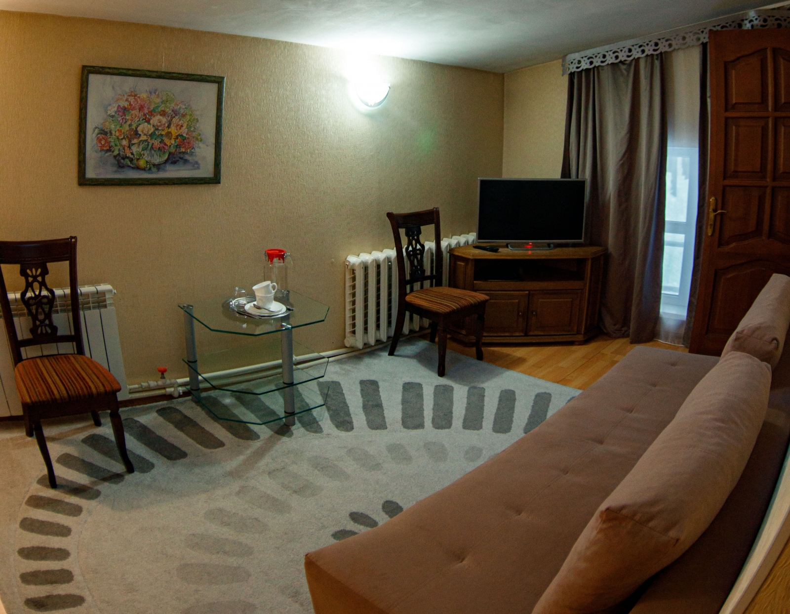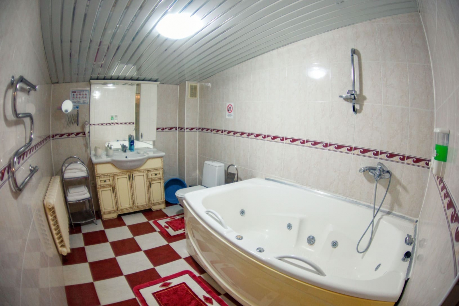 Площадь номера - 40 кв.м. 1 осн. место. 2 доп. места. Мебель: диван, кровать двуспальная, прикроватные тумбочки, стол, стулья, шкаф. Оборудование: кондиционер, мини-холодильник, набор посуды, сейф, телевизор, электрочайник. Санузел: с джакузи, туалетные принадлежности, фен. Сервис: Wi-Fi бесплатно, смена полотенец, смена постельного белья, уборка номера.