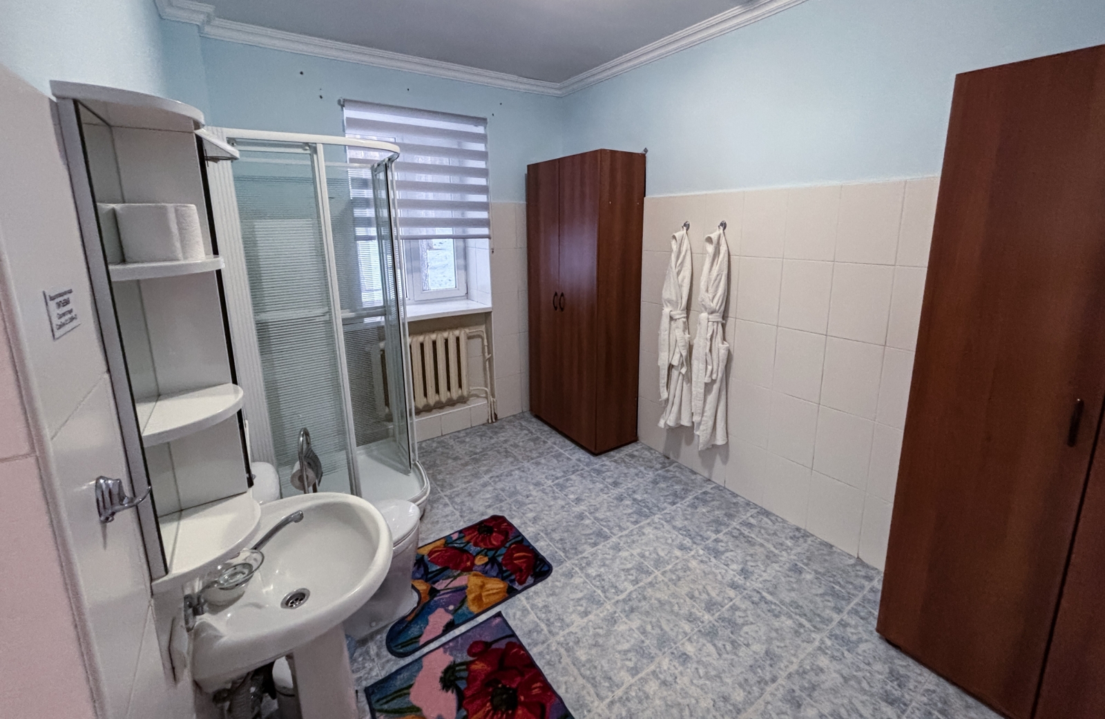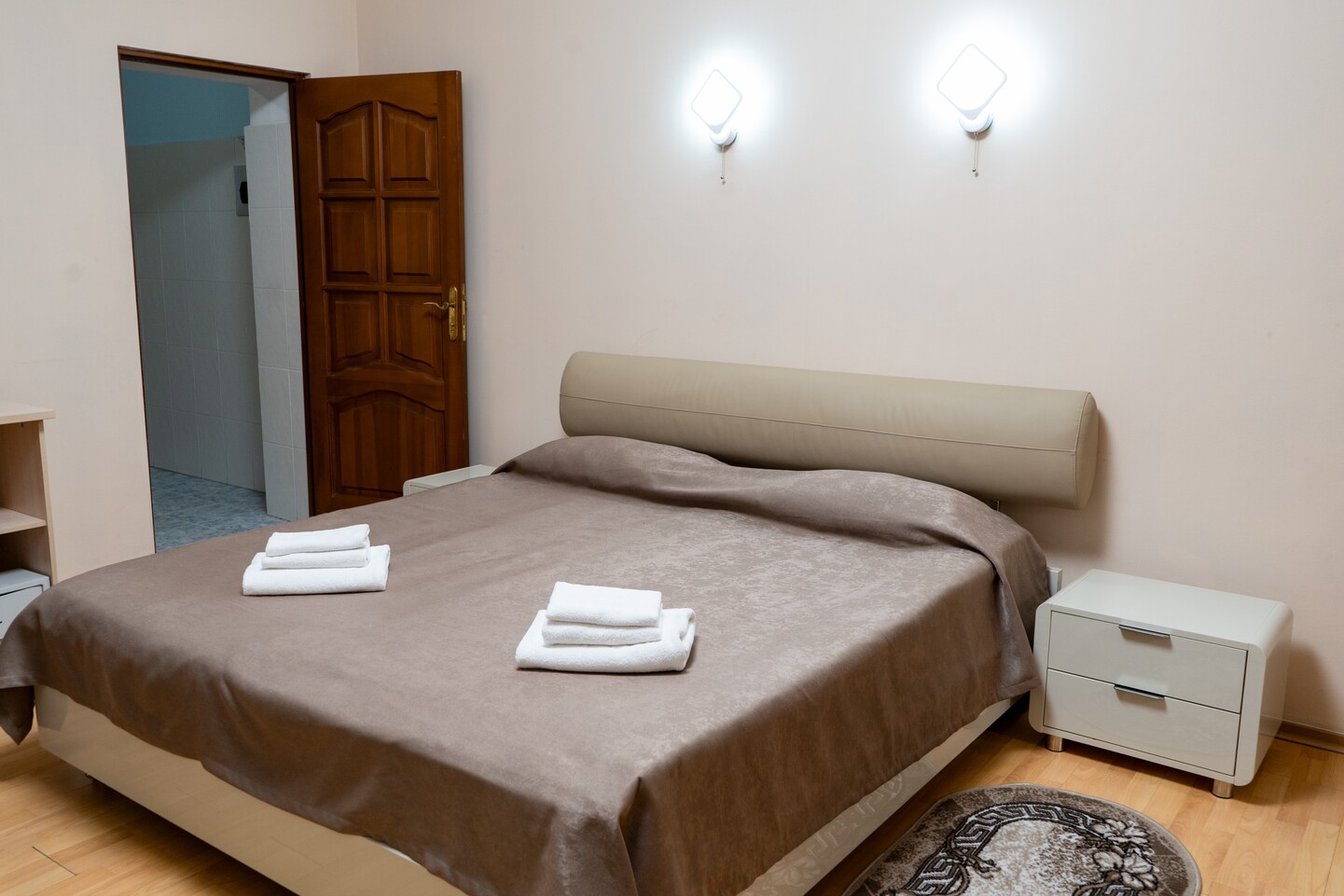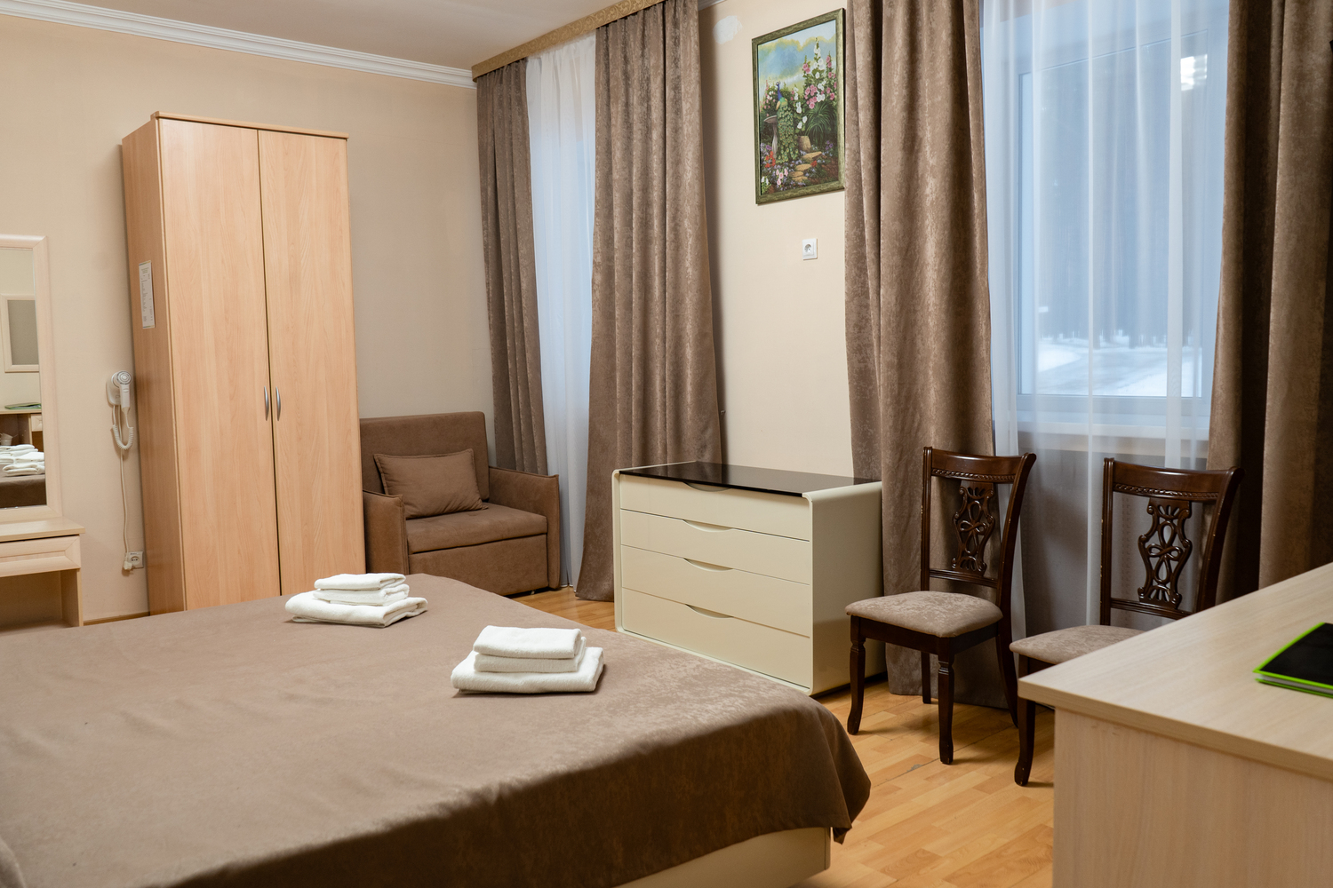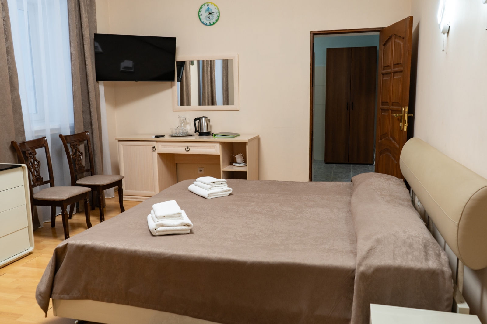 Площадь номера - 22-27 кв.м. 1 осн. место. 2 доп. места. Мебель: кресло, кровать двуспальная, прикроватные тумбочки, стол, стулья, шкаф. Оборудование: мини-холодильник, набор посуды, сейф, телевизор, электрочайник. Санузел: с душем, туалетные принадлежности, фен. Сервис: Wi-Fi бесплатно, смена полотенец, смена постельного белья, уборка номера.