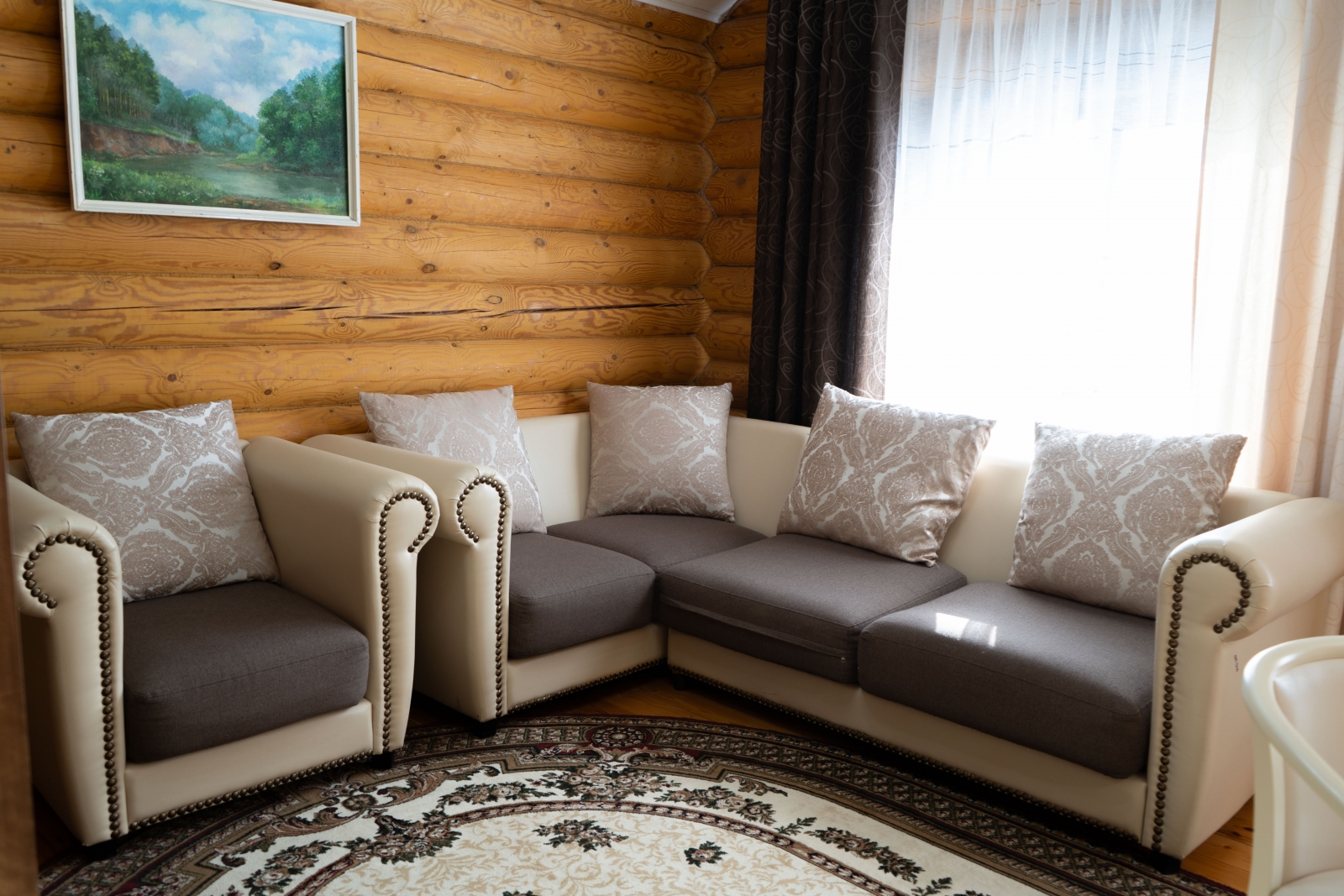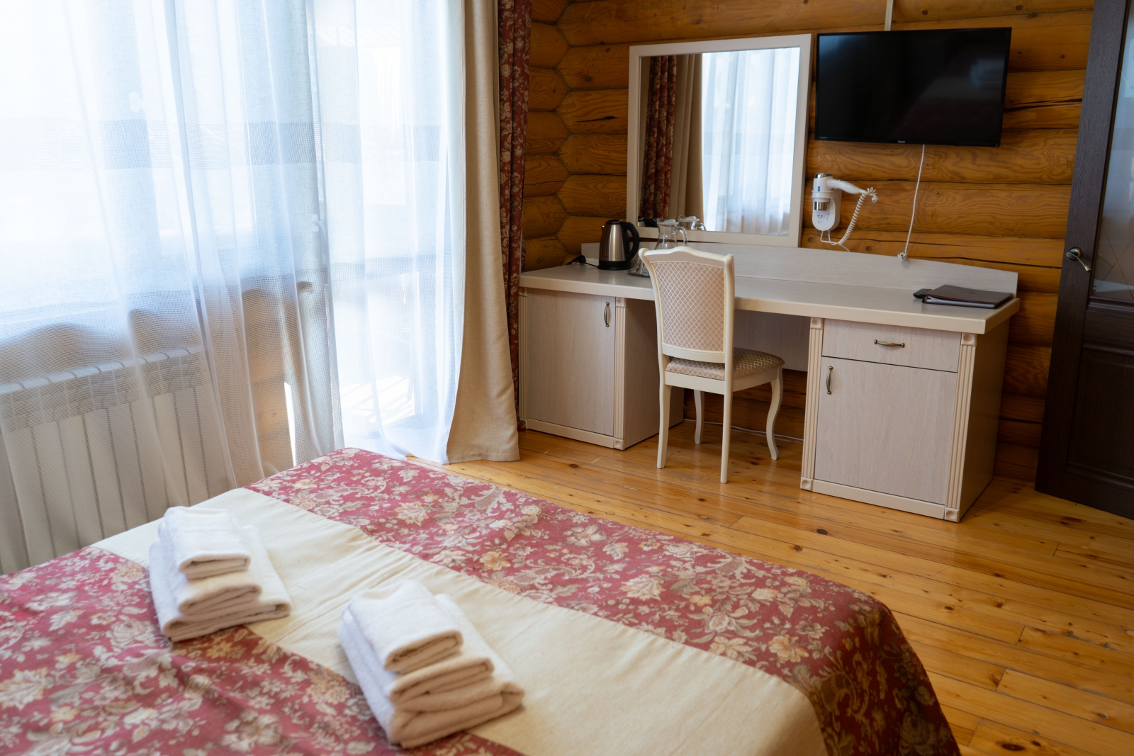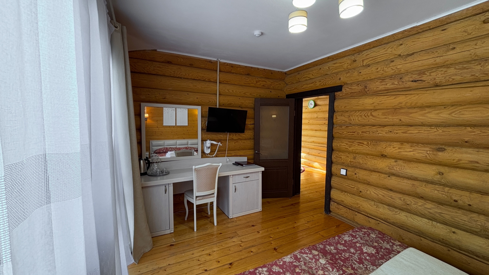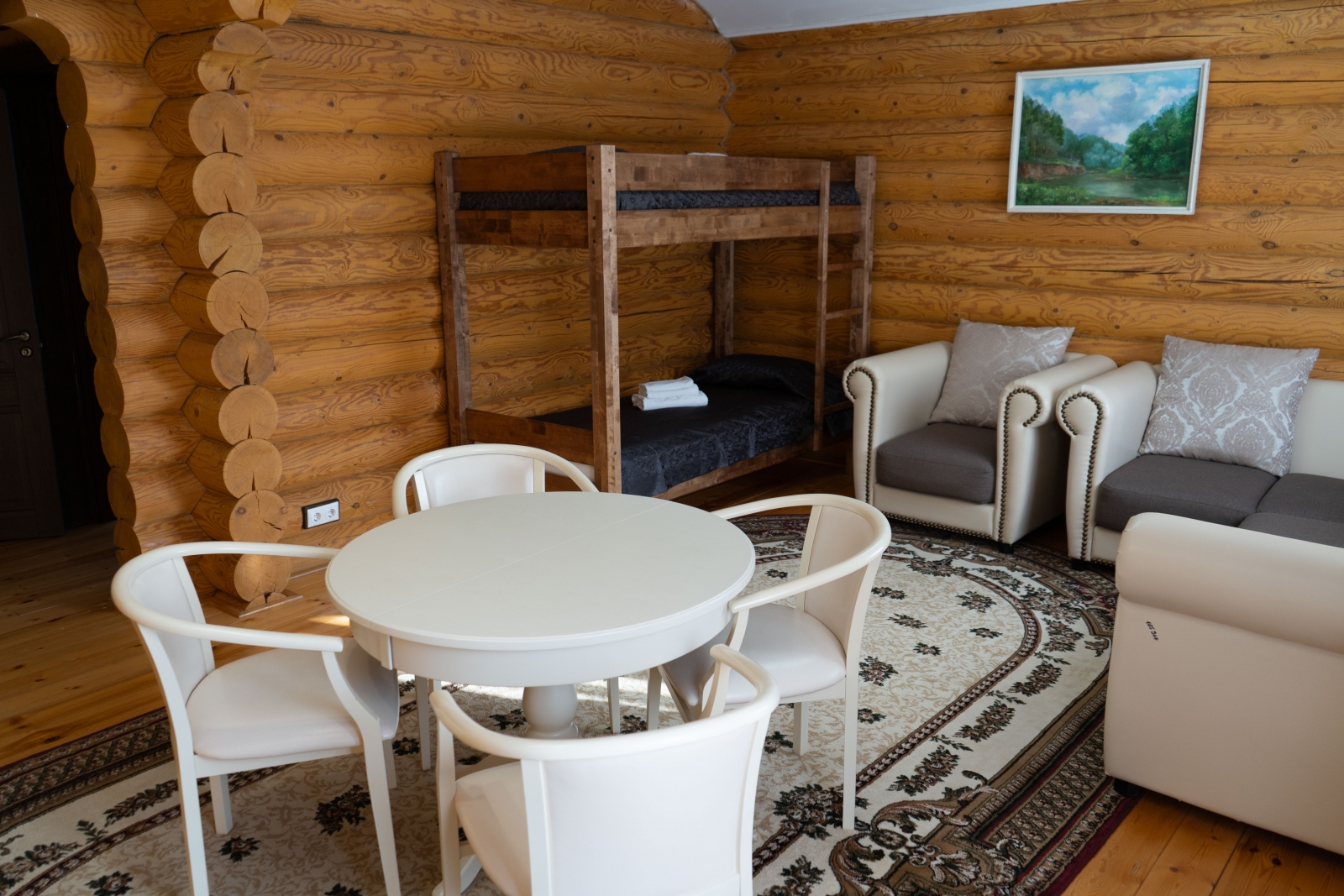 Площадь номера - 49 кв.м. 1 осн. место. 4 доп. места. Балкон. Мебель: диван раскладной, кровать двуспальная, кровать двухъярусная, прикроватные тумбочки, стол, стулья, шкаф. Оборудование: кондиционер, мини-холодильник, набор посуды, телевизор, электрочайник. Санузел: с джакузи, туалетные принадлежности, фен. Сервис: Wi-Fi бесплатно, смена полотенец, смена постельного белья, уборка номера.