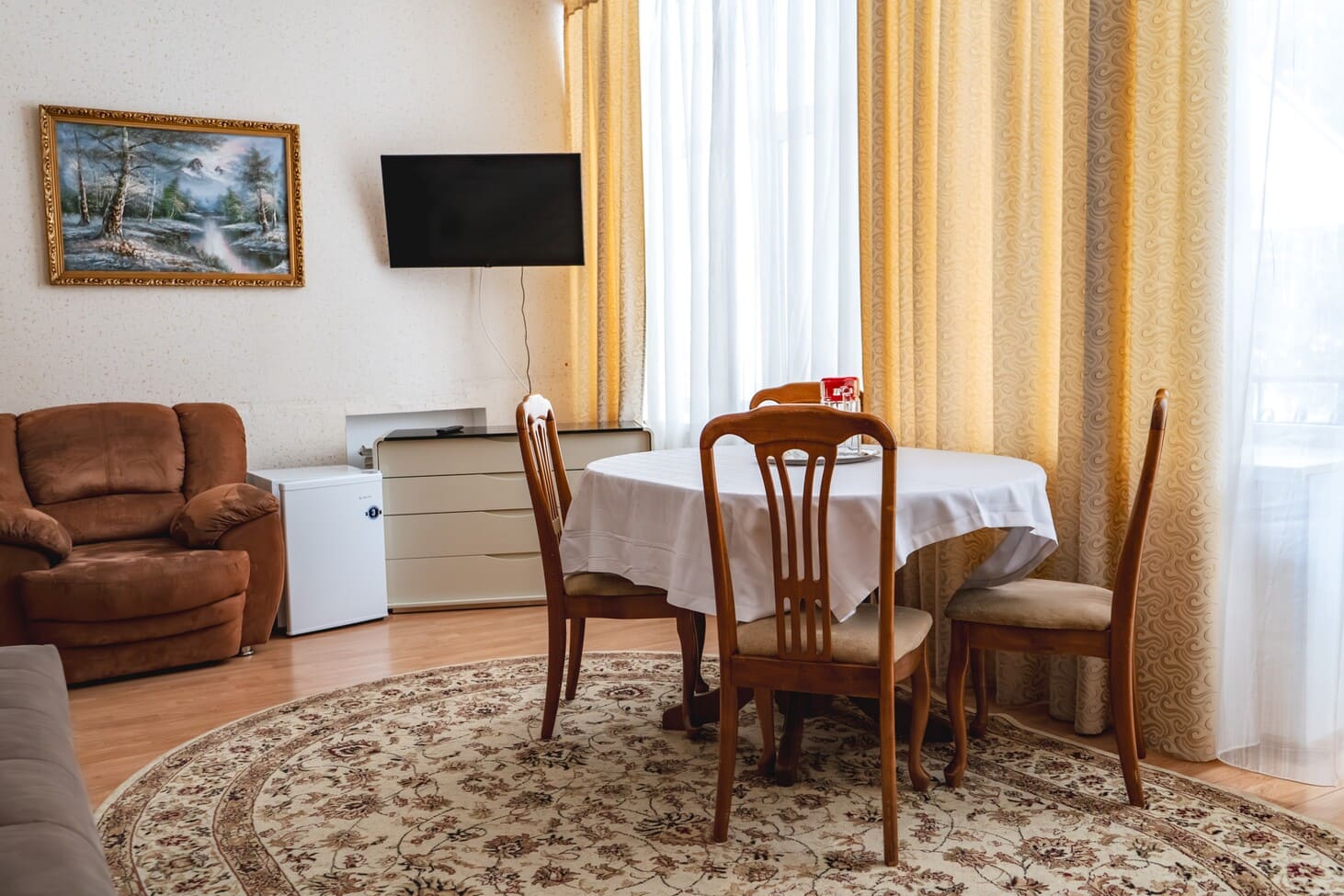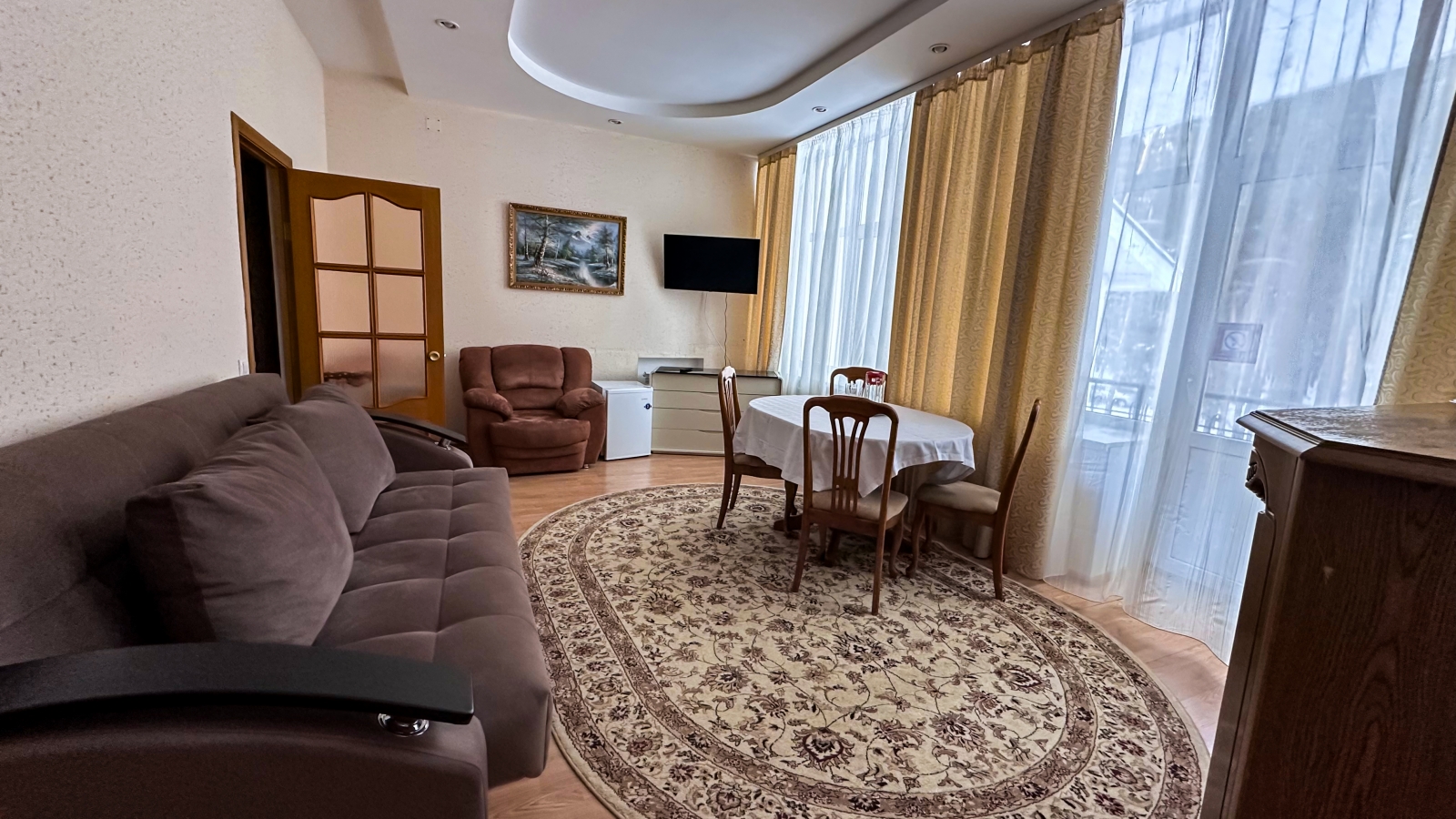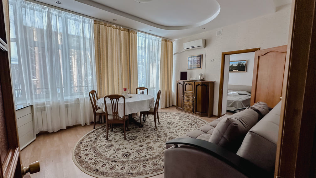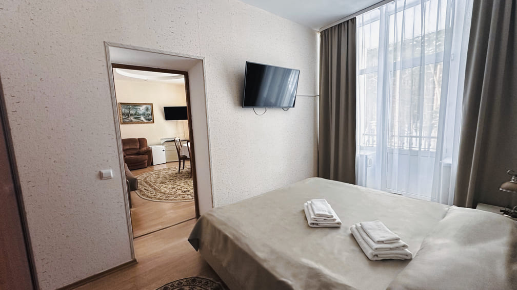 Площадь номера - 47 кв.м. 1 осн. место. 3 доп. места. Балкон. Мебель: диван раскладной, кресла, кровать двуспальная, прикроватные тумбочки, стол, стулья, шкаф. Оборудование: гладильная доска, кондиционер, набор посуды, сейф, телевизор, холодильник, электрочайник. Санузел: с душем, туалетные принадлежности, фен. Сервис: Wi-Fi бесплатно, смена полотенец, смена постельного белья, уборка номера.