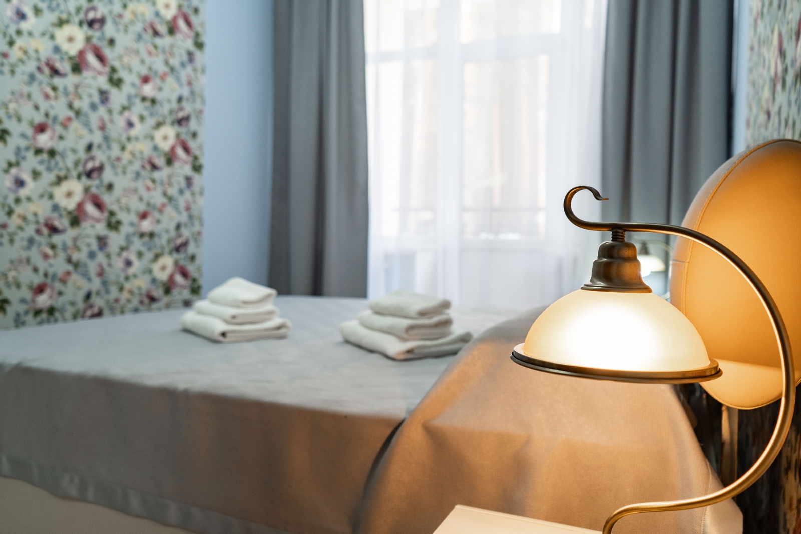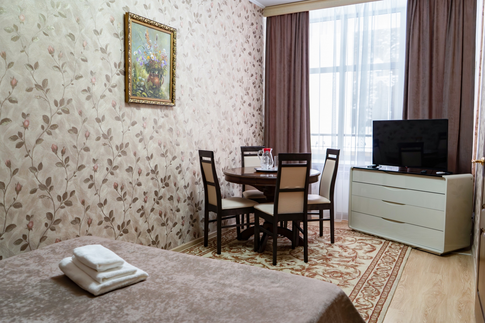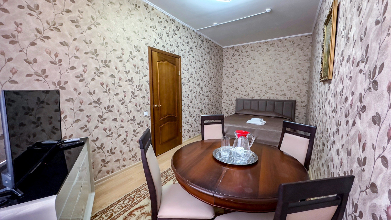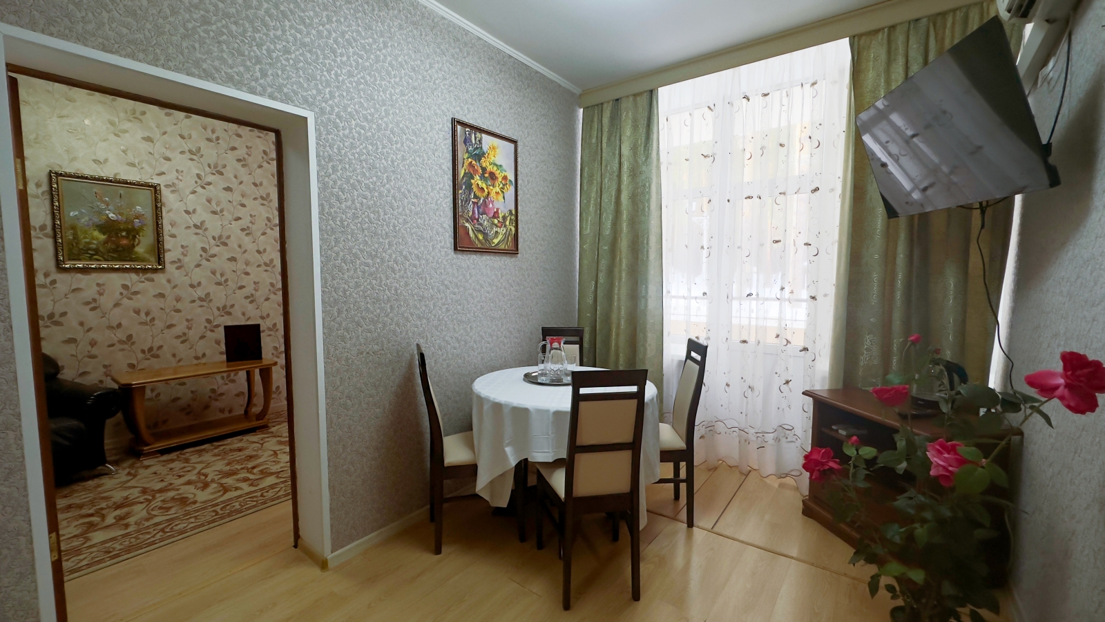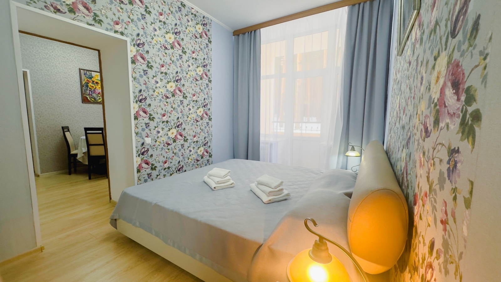 Площадь номера - 47 кв.м. 2 осн. места. 2 доп. места. Балкон. Мебель: диван раскладной, кресла, кровать двуспальная, прикроватные тумбочки, стол, стулья, шкаф. Оборудование: гладильная доска, кондиционер, набор посуды, сейф, телевизор, холодильник, электрочайник. Санузел: с душем, туалетные принадлежности, фен. Сервис: Wi-Fi бесплатно, смена полотенец, смена постельного белья, уборка номера.