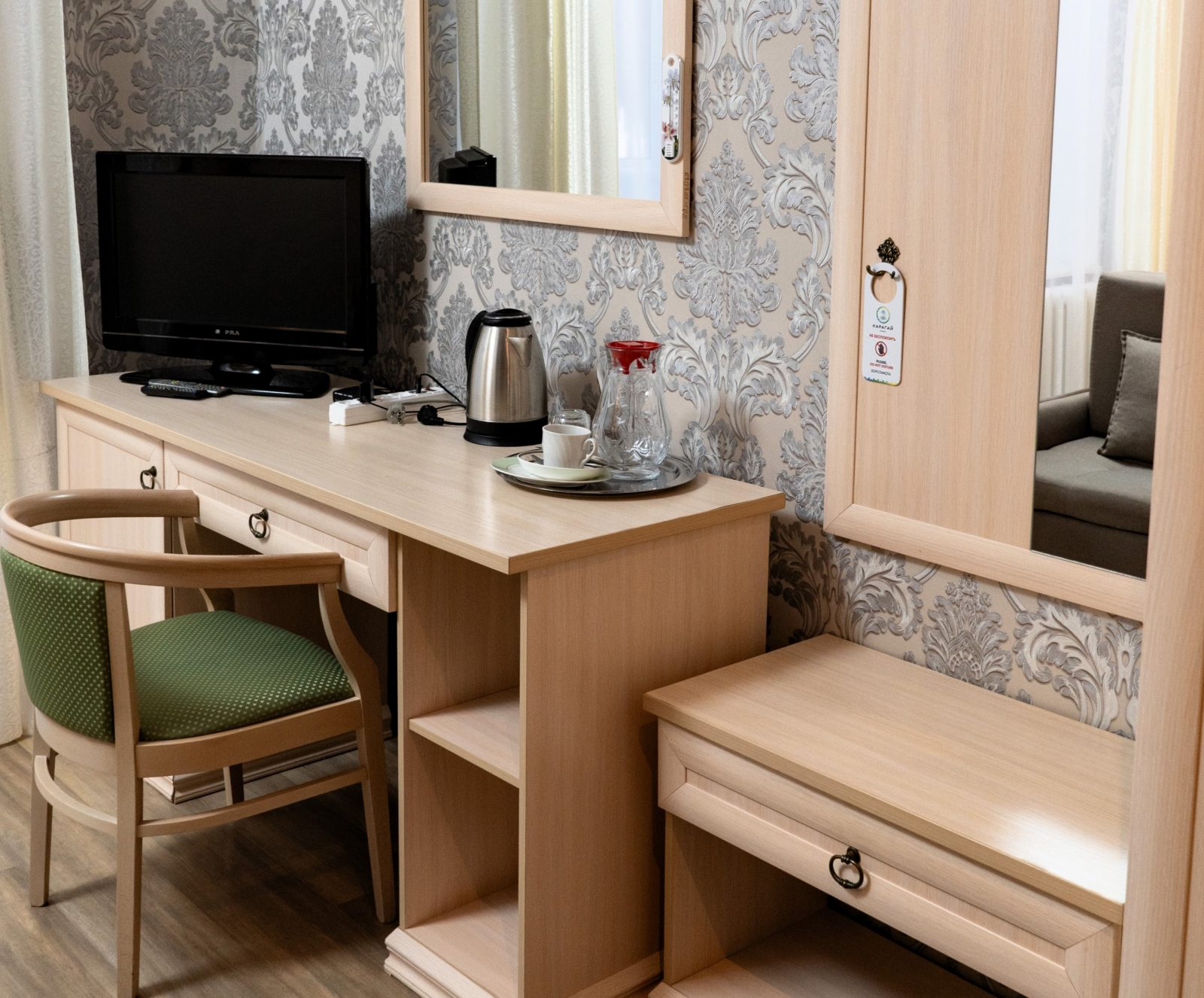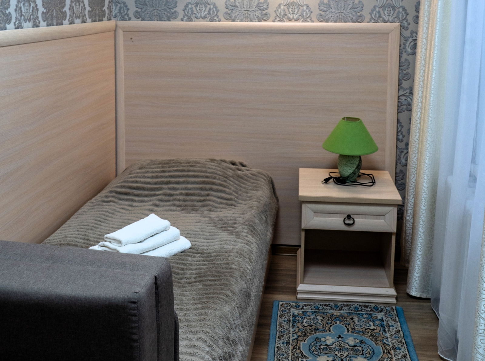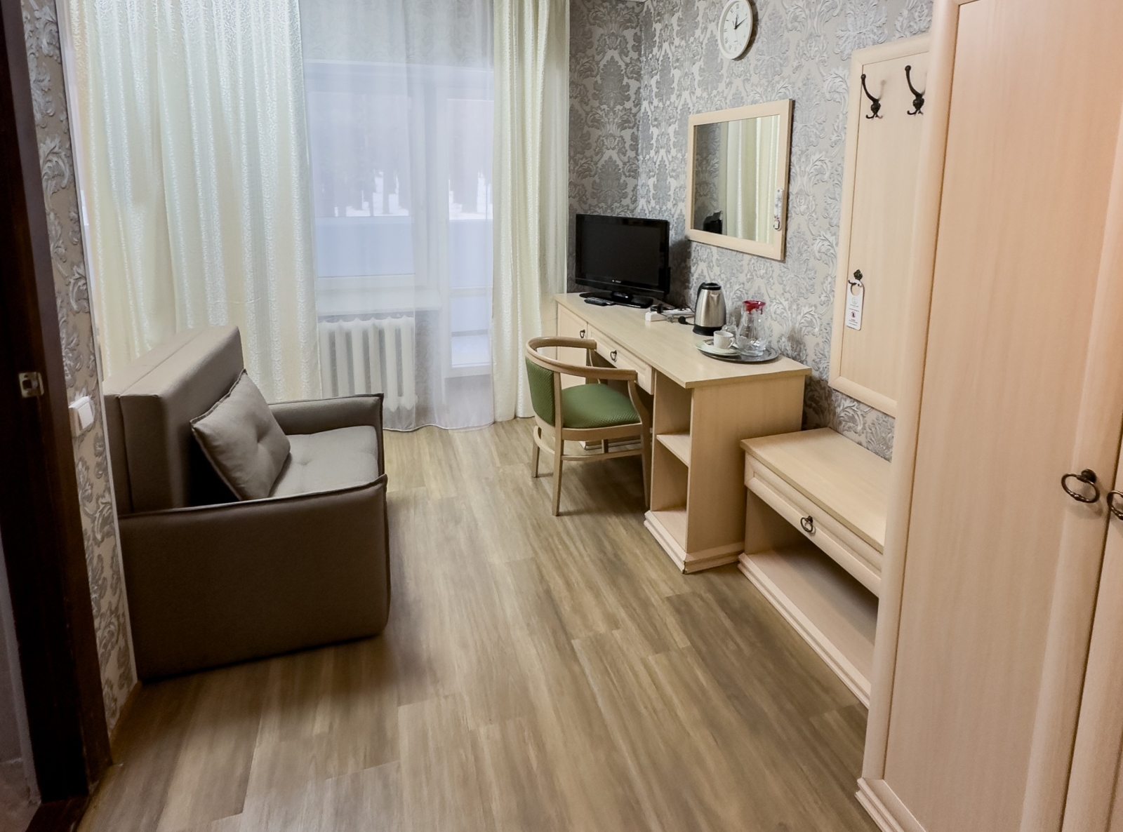 Площадь номера - 16 кв.м. 1 осн. место. 1 доп. место. Балкон. Мебель: кресло-кровать, кровать односпальная, прикроватная тумбочка, стол, стул, шкаф. Оборудование: набор посуды, сейф, телевизор, холодильник, электрочайник. Санузел: с душем, фен. Сервис: Wi-Fi бесплатно, смена полотенец, смена постельного белья, уборка номера.