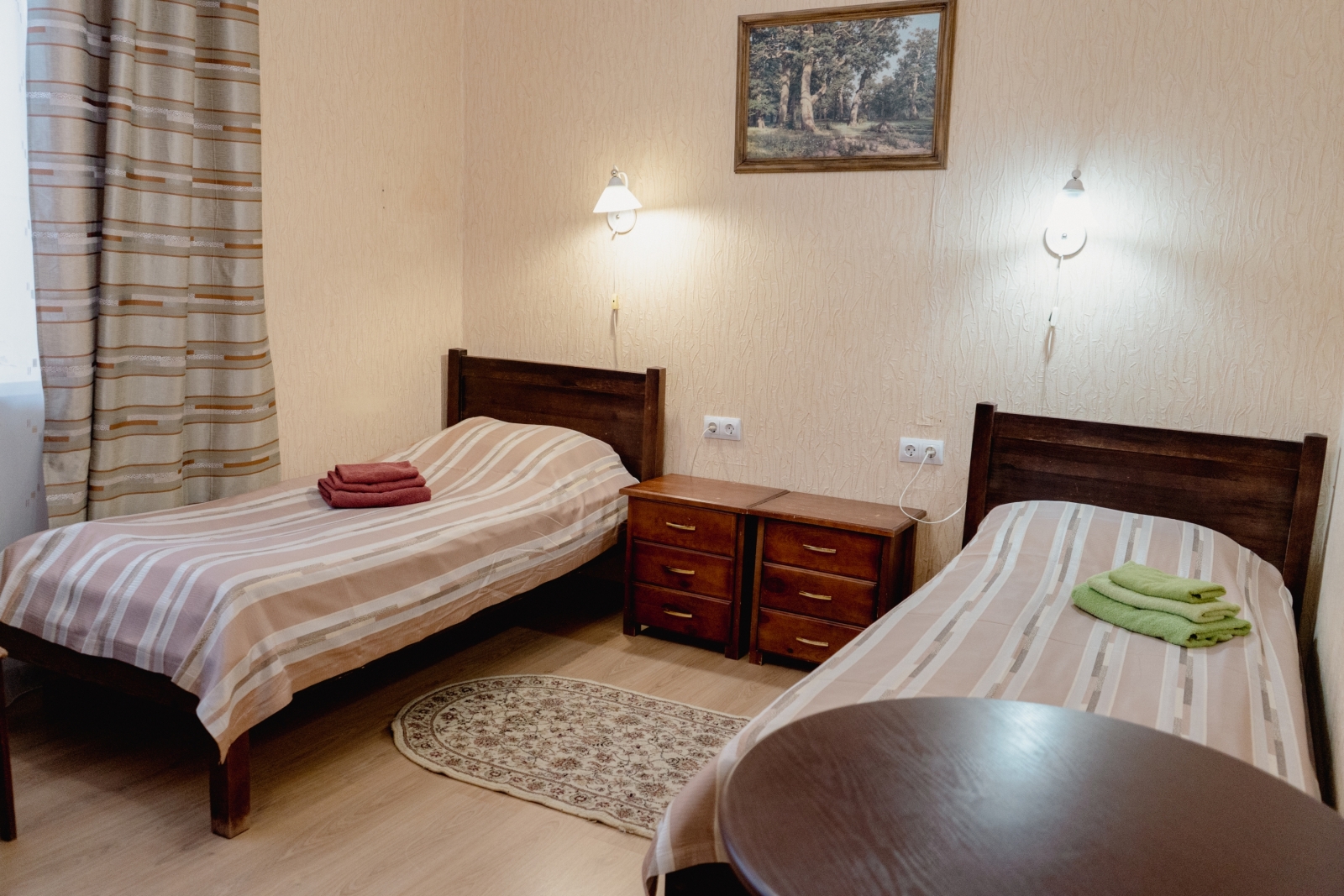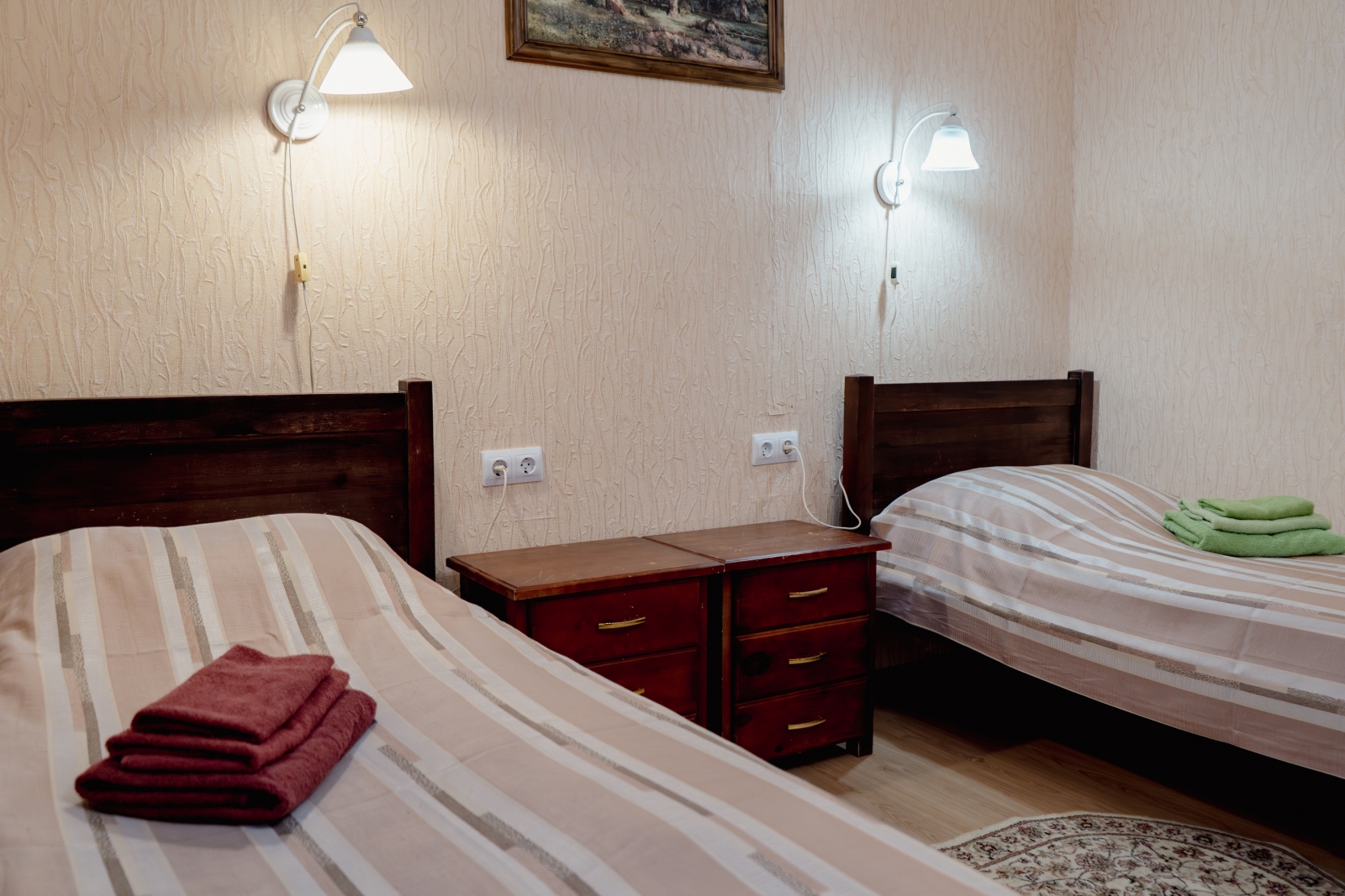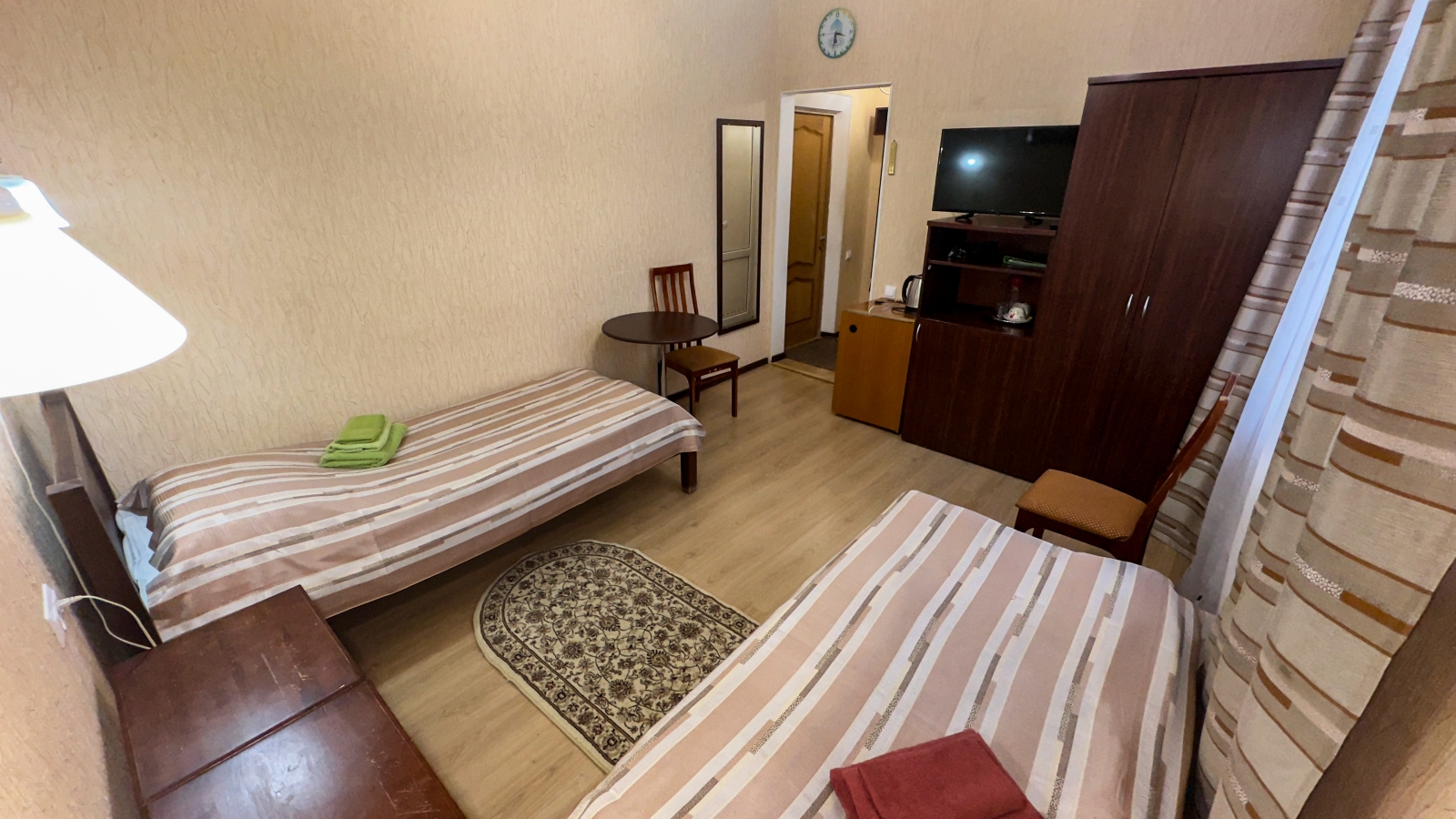 2 осн. места. Мебель: кровати односпальные, прикроватные тумбочки, стол, стулья, шкаф-купе. Оборудование: гладильная доска, мини-холодильник, сейф, телевизор, утюг, чайный набор посуды, электрочайник. Санузел: с душем, фен. Сервис: Wi-Fi бесплатно, смена полотенец, смена постельного белья, уборка номера.