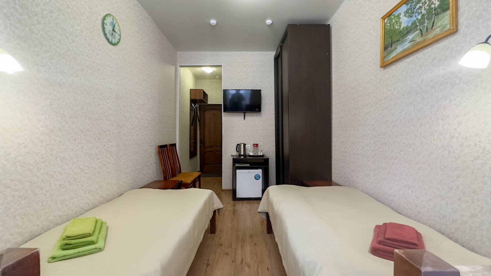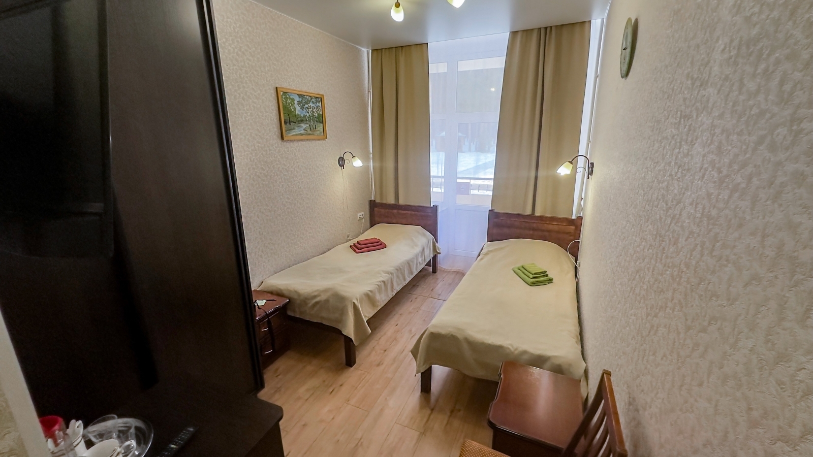 Площадь номера - 15-17 кв.м. 2 осн. места. Балкон. Мебель: кровати односпальные, прикроватные тумбочки, стол, стул, шкаф. Оборудование: набор посуды, сейф, телевизор, холодильник, электрочайник. Санузел. Сервис: Wi-Fi бесплатно, смена полотенец, смена постельного белья, уборка номера.